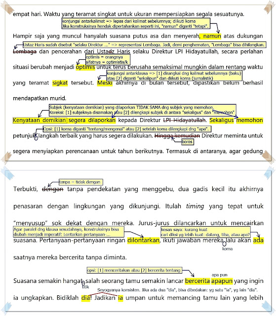Dua berkas tulisan masuk mengiringi pesan itu. Cuplikan kedua naskah itu tampak seperti foto di atas. Itu penampakan setelah dicoret-coret oleh si penerima kiriman naskah. Jumlah dan kekerapan target koreksi pada tulisan mereka mengindikasikan keduanya benar-benar pemula.